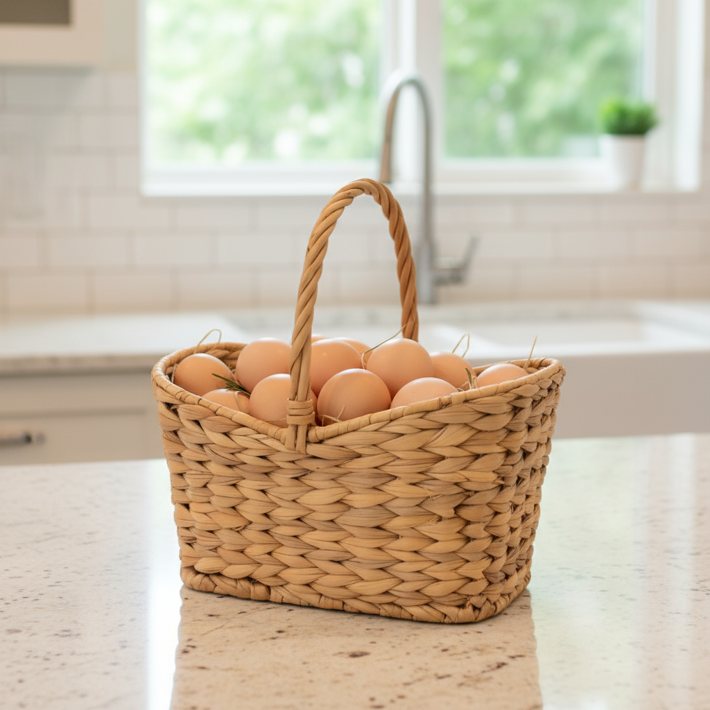A handwoven water hyacinth basket designed for storing and displaying eggs with rustic, eco-friendly charm.
