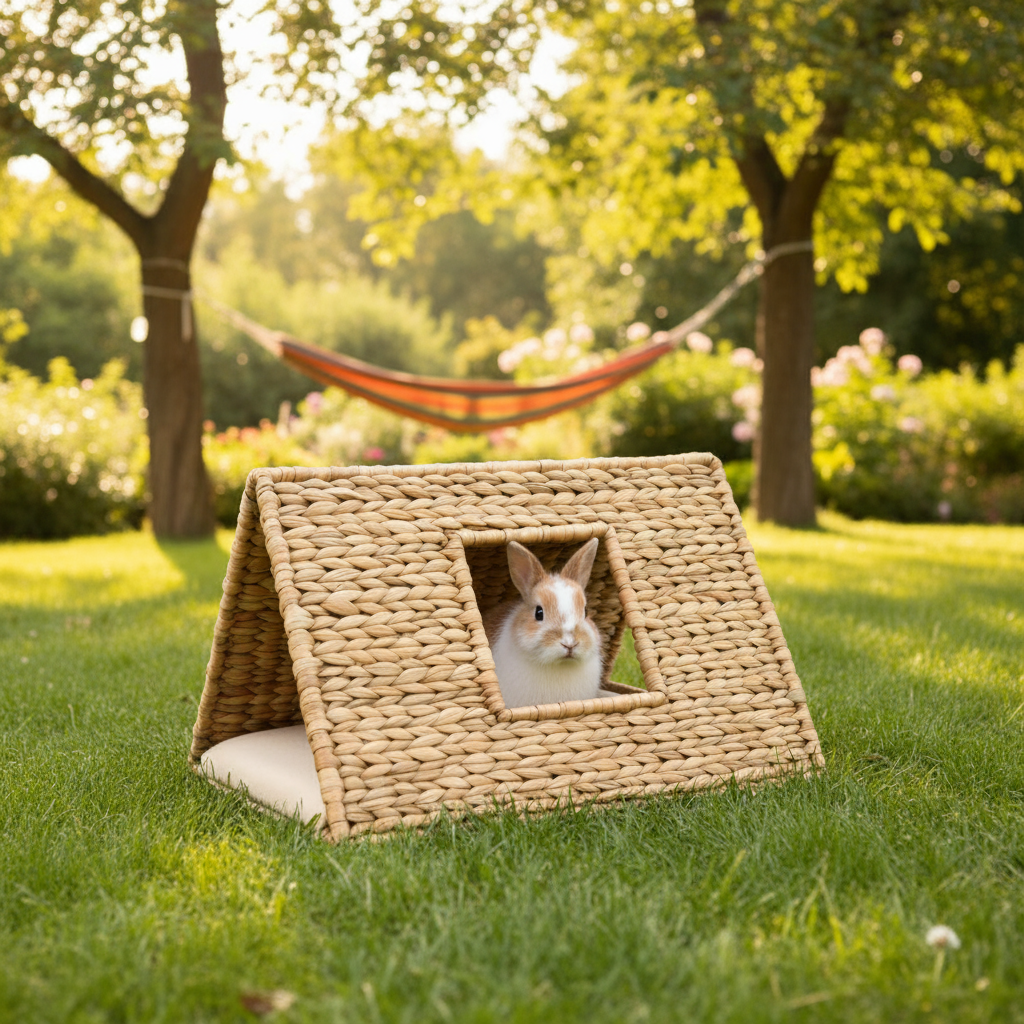 A natural water hyacinth rabbit house that offers small pets a cozy, ventilated, and secure hideaway for resting and sleeping.