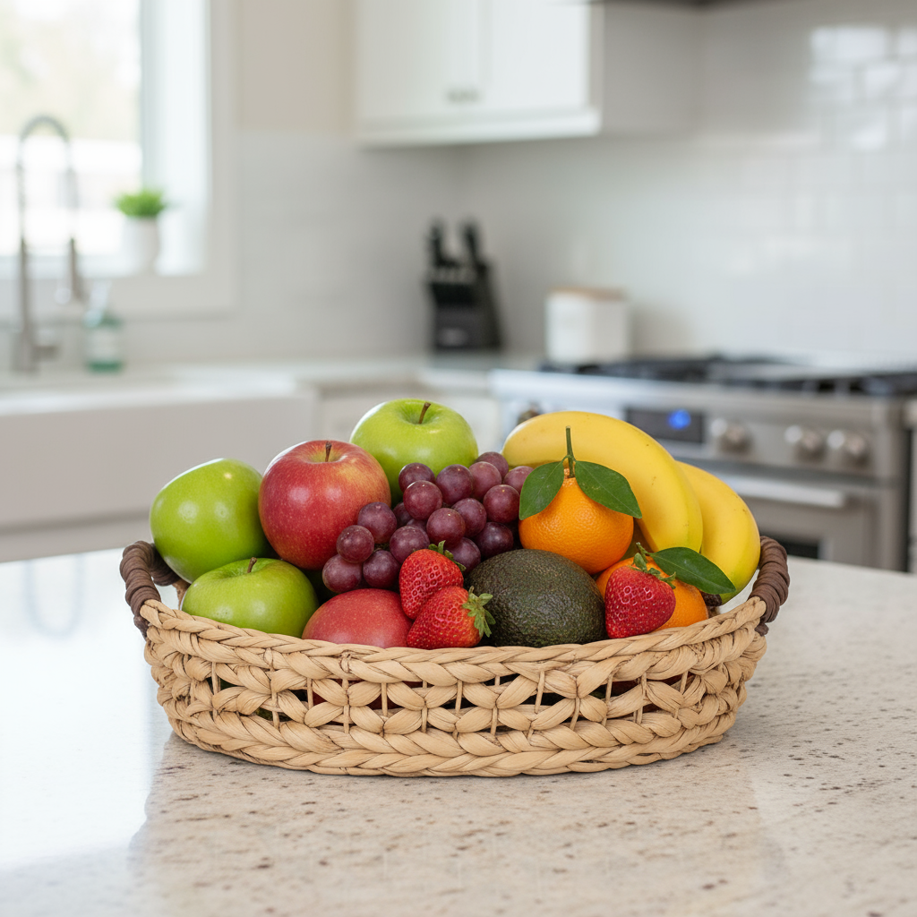 A handwoven water hyacinth serving tray with sturdy side handles, perfect for eco-friendly serving, organizing, and decorating in any room.